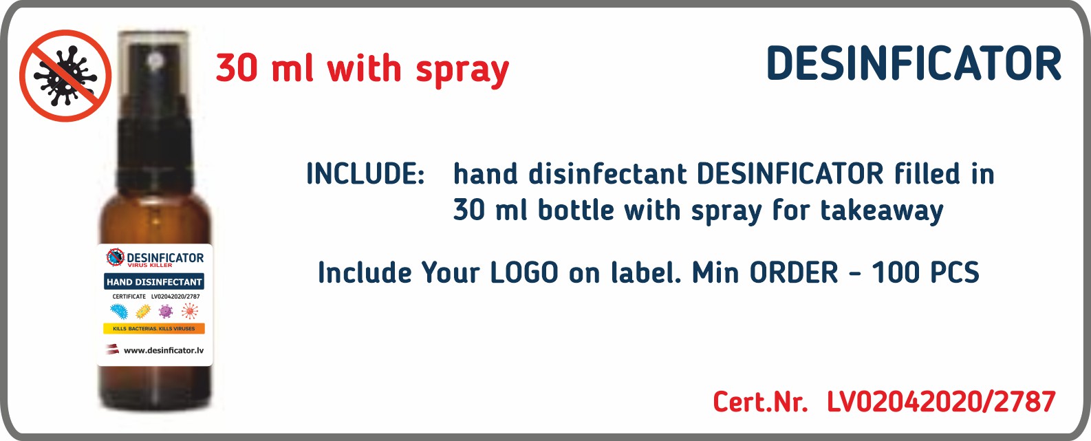 30ml spray bottle with filled DESINFICATOR HP. Include Your LOGO on label. Min order 100 pcs